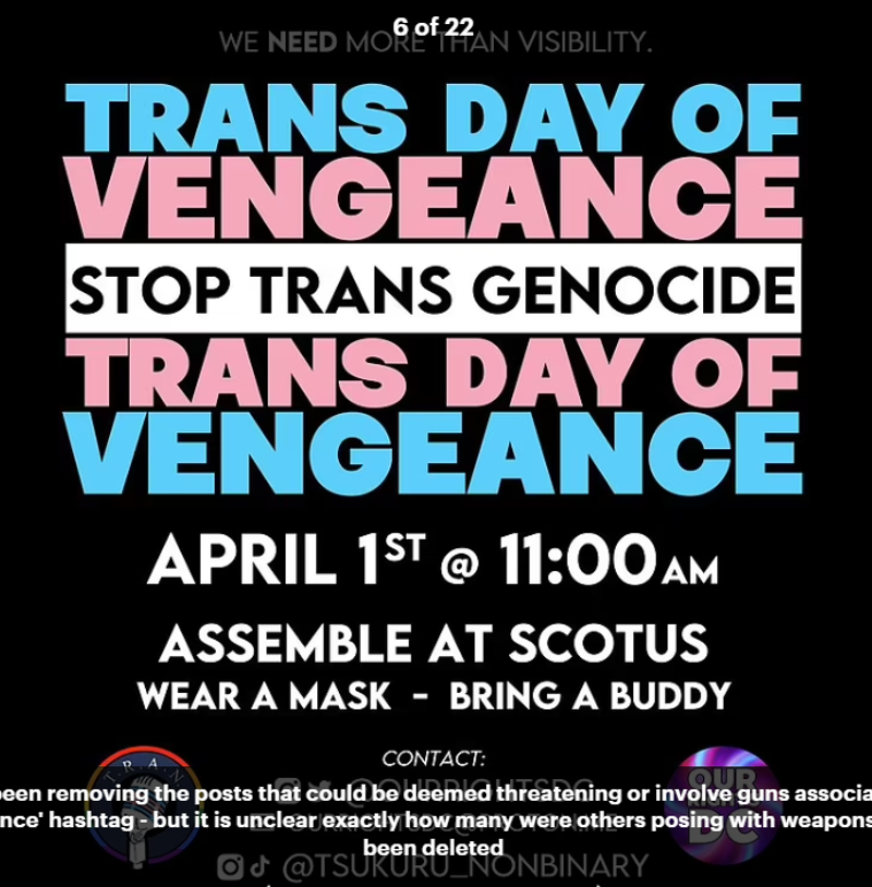 Activists are being encouraged to 'bring a buddy' and wear a mask at the event outside of the Supreme Court in DC on April 1, and is billed as avenging a 'trans genocide.'